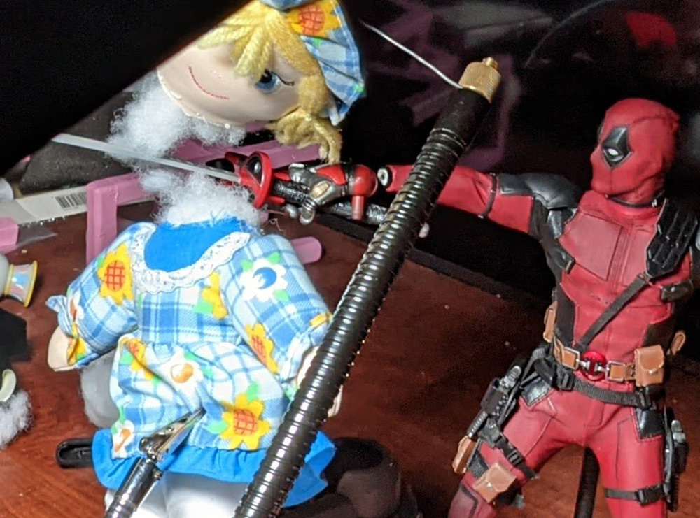 I then set up the scene so Deadpool was swinging his katana at the doll.
